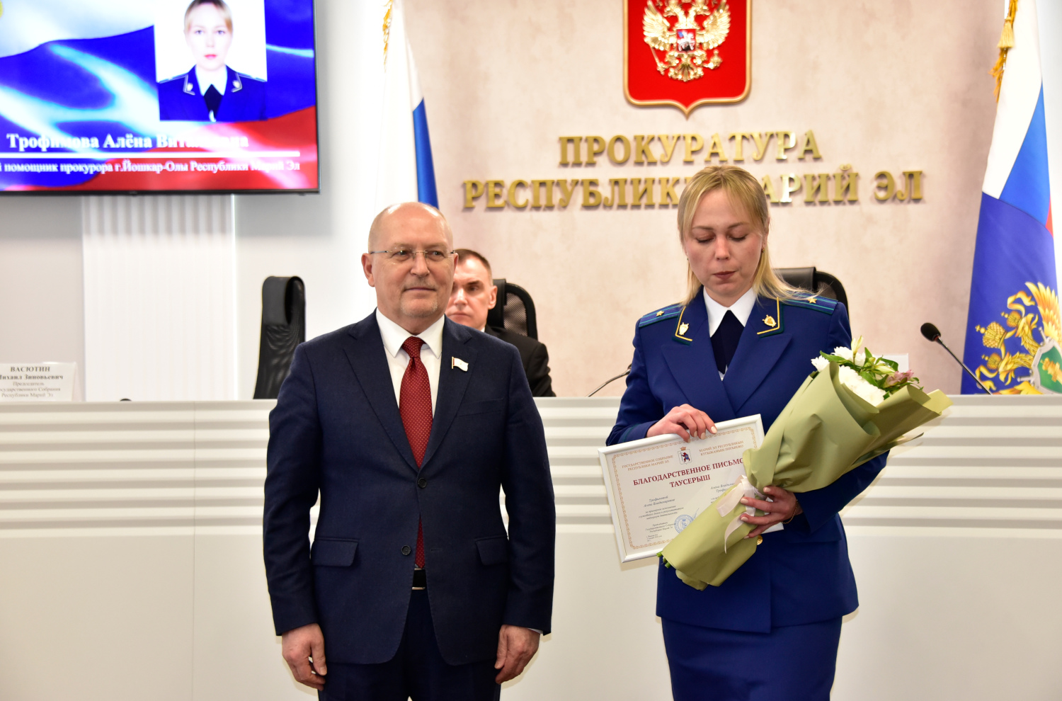 Благодарственными письмами Государственного Собрания Республики Марий Эл поощрены старший прокурор отдела по надзору за уголовно-процессуальной и оперативно-розыскной деятельностью прокуратуры республики Марина Леухина, старший помощник прокурора г. Йошкар-Олы Алена Трофимова и помощник прокурора республики по надзору за исполнением законодательства о несовершеннолетних, соблюдением их прав и законных интересов Наталья Шамшурова.