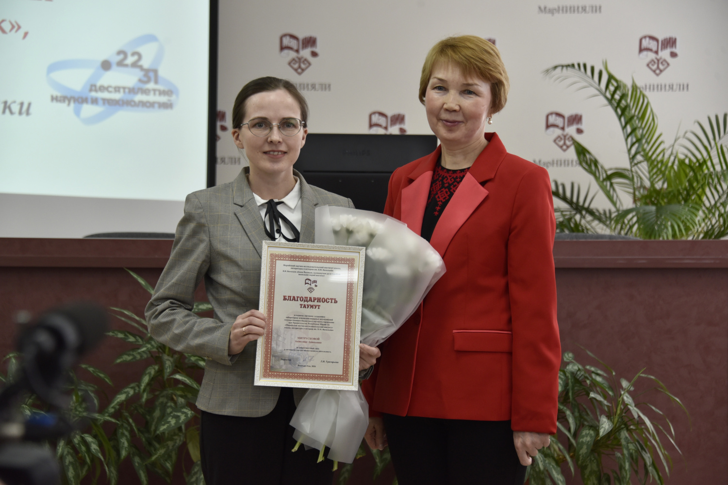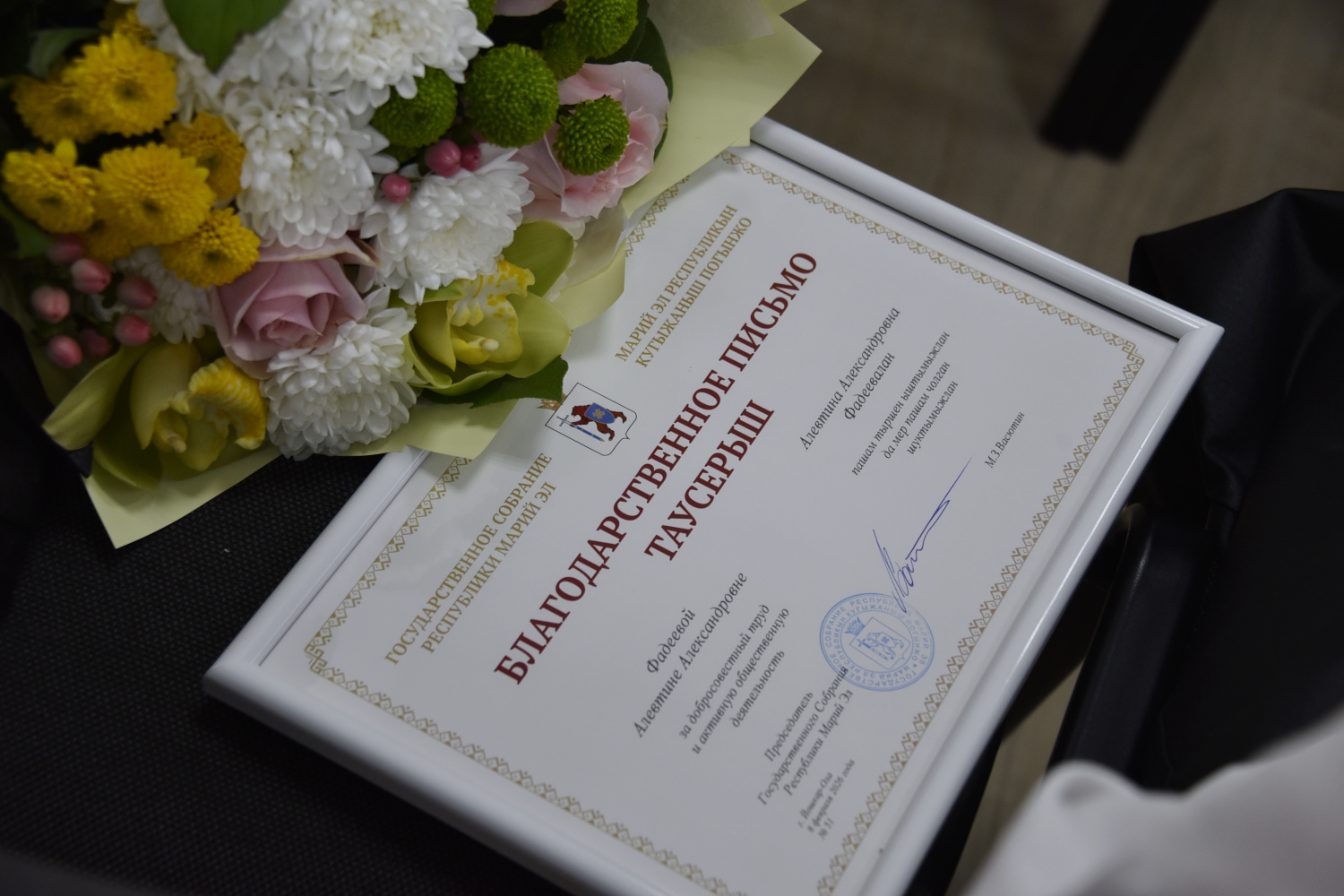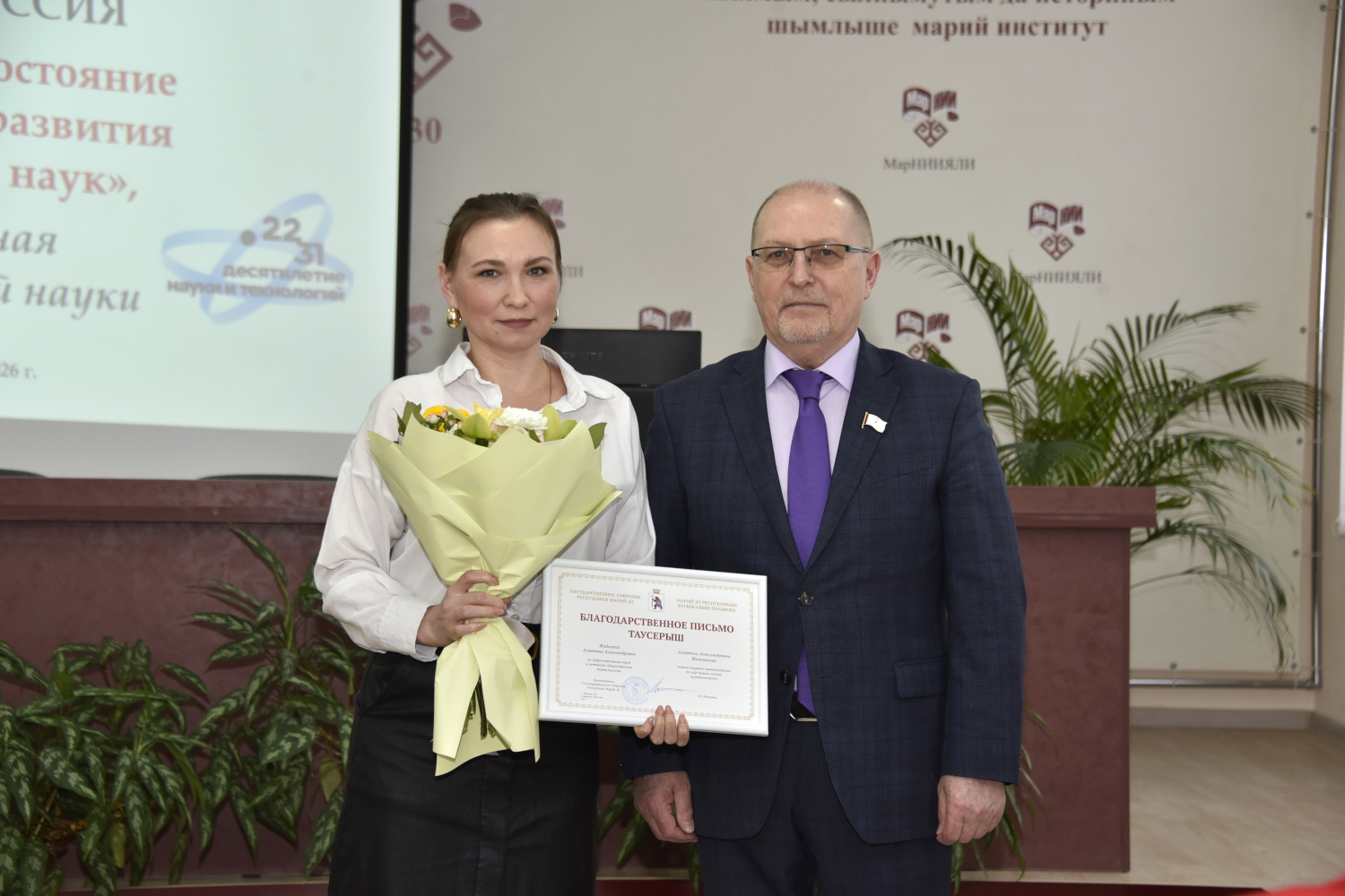 В ходе торжественной части Михаил Васютин вручил Благодарственное письмо законодательного органа главному бухгалтеру МарНИИЯЛИ им. В.М. Васильева Алевтине Фадеевой за добросовестный труд и активную общественную деятельность.