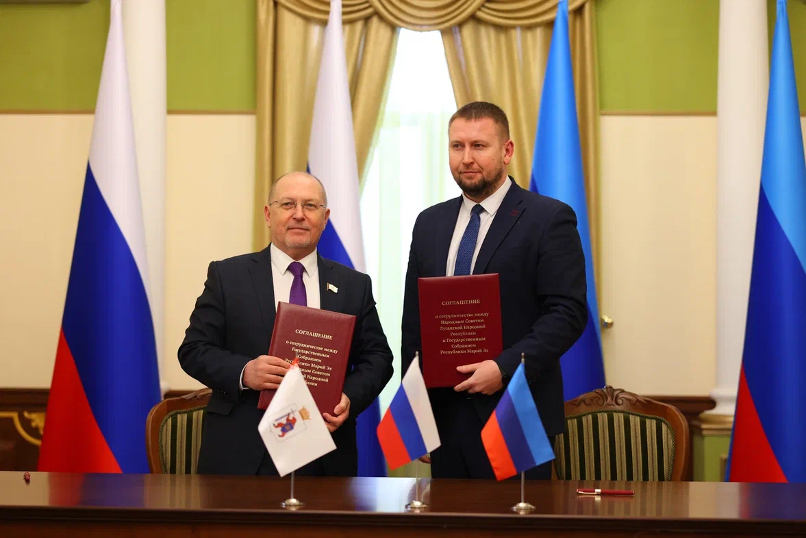 Марийский парламент расширяет сотрудничество с историческими регионами. Сегодня в Луганске подписано соглашение между Государственным Собранием Республики Марий Эл и Народным Советом Луганской Народной Республики. Подписи под документом поставили руководители законодательных органов — Михаил Васютин и Денис Мирошниченко.