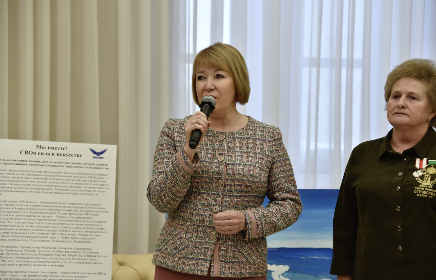 Перед началом заседания гости ознакомились с выставкой «Мы вместе! СВОя сила в искусстве», на которой представлено 30 работ матерей, жён, сестер участников СВО из разных регионов России, в том числе и нашей республики.