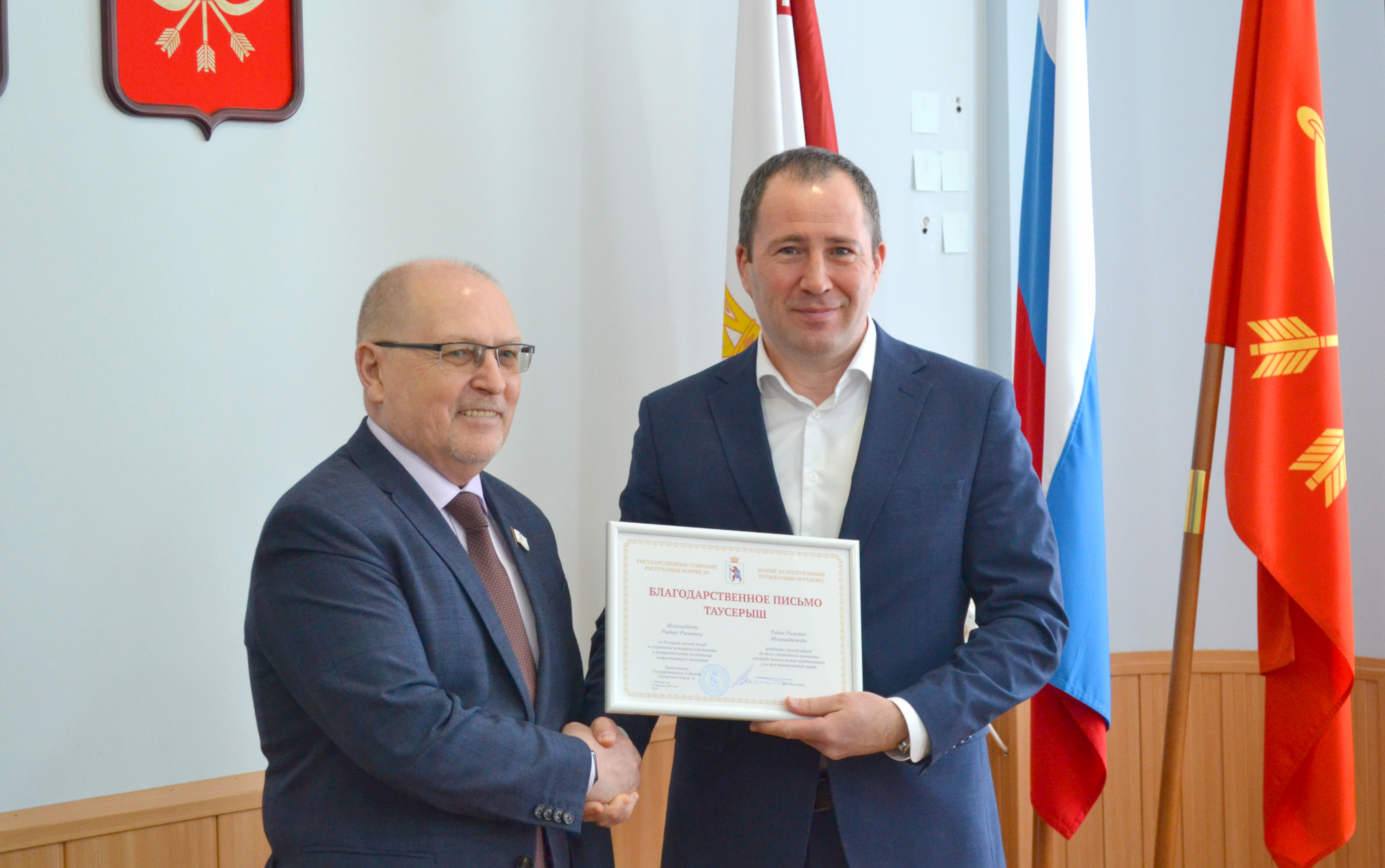 В рамках сессии Председатель Госсобрания вручил Благодарственное письмо парламента депутату Собрания депутатов городского округа «Город Козьмодемьянск» Радику Мухамадееву за большой личный вклад в сохранение исторической памяти и патриотическое воспитание подрастающего поколения.