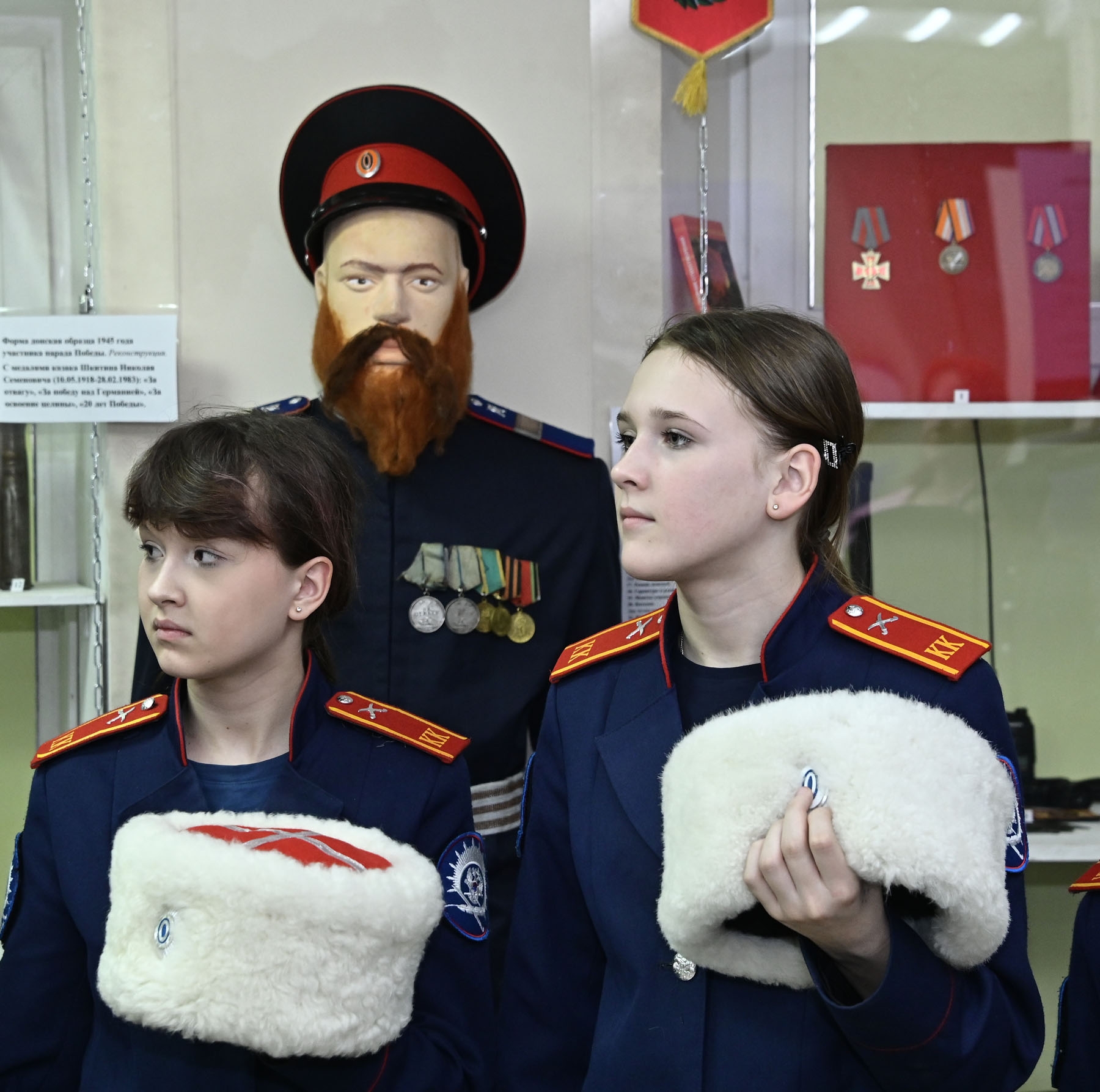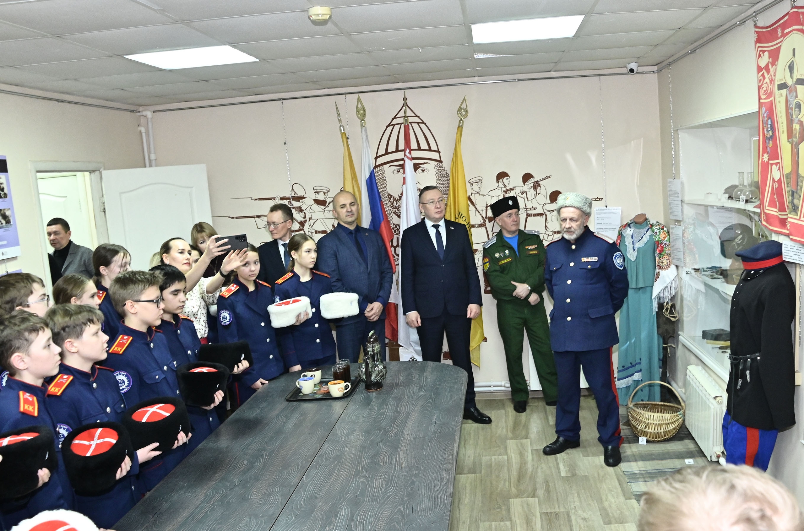 Главным экскурсоводом выступил автор и идейный вдохновитель проекта, товарищ атамана, есаул Андрей Фещуков. Он провел первых посетителей — почетных гостей и юных казачат-кадетов из школы № 32 по экспозиции, рассказав об экспонатах.
