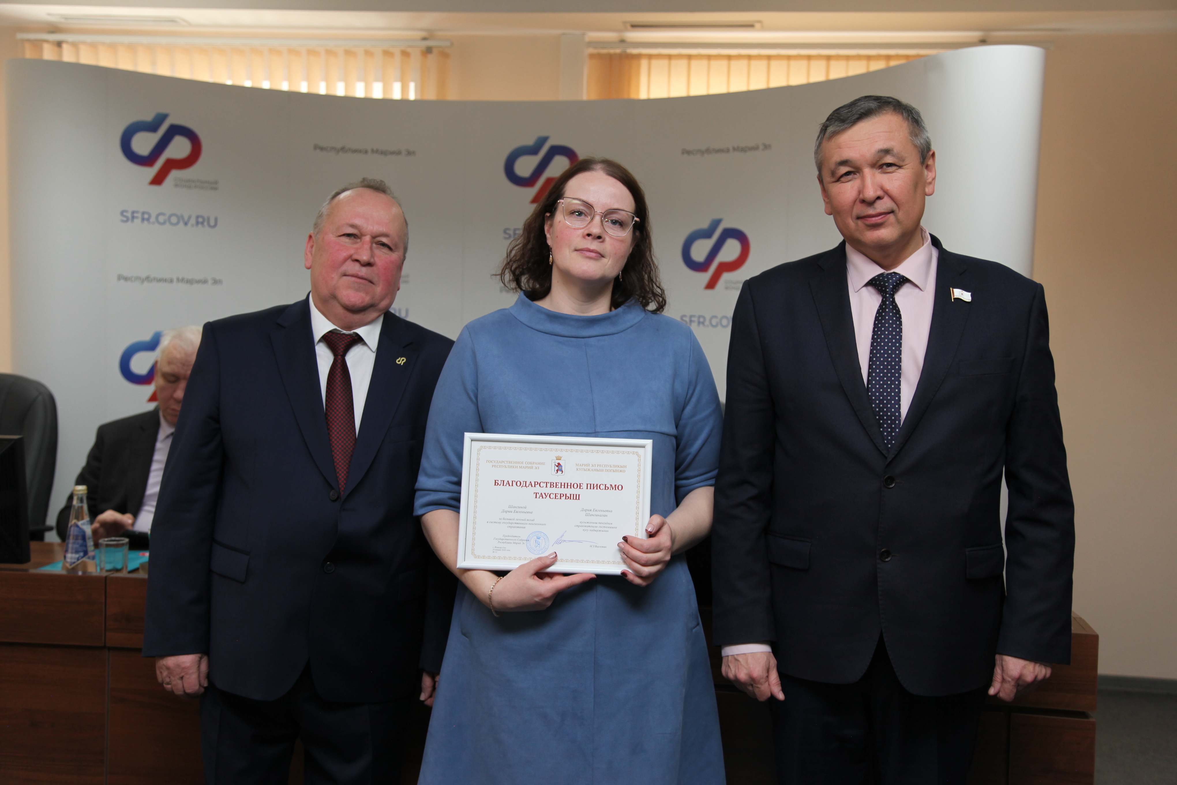 От имени Председателя Госсобрания Александр Майоров вручил ведомственные награды парламента республики. За большой личный вклад в развитие системы государственного пенсионного страхования Благодарственных писем законодательного органа удостоены ведущие специалисты-эксперты управления персонифицированного учета и администрирования страховых взносов Римма Байдимирова и Дария Шангина.