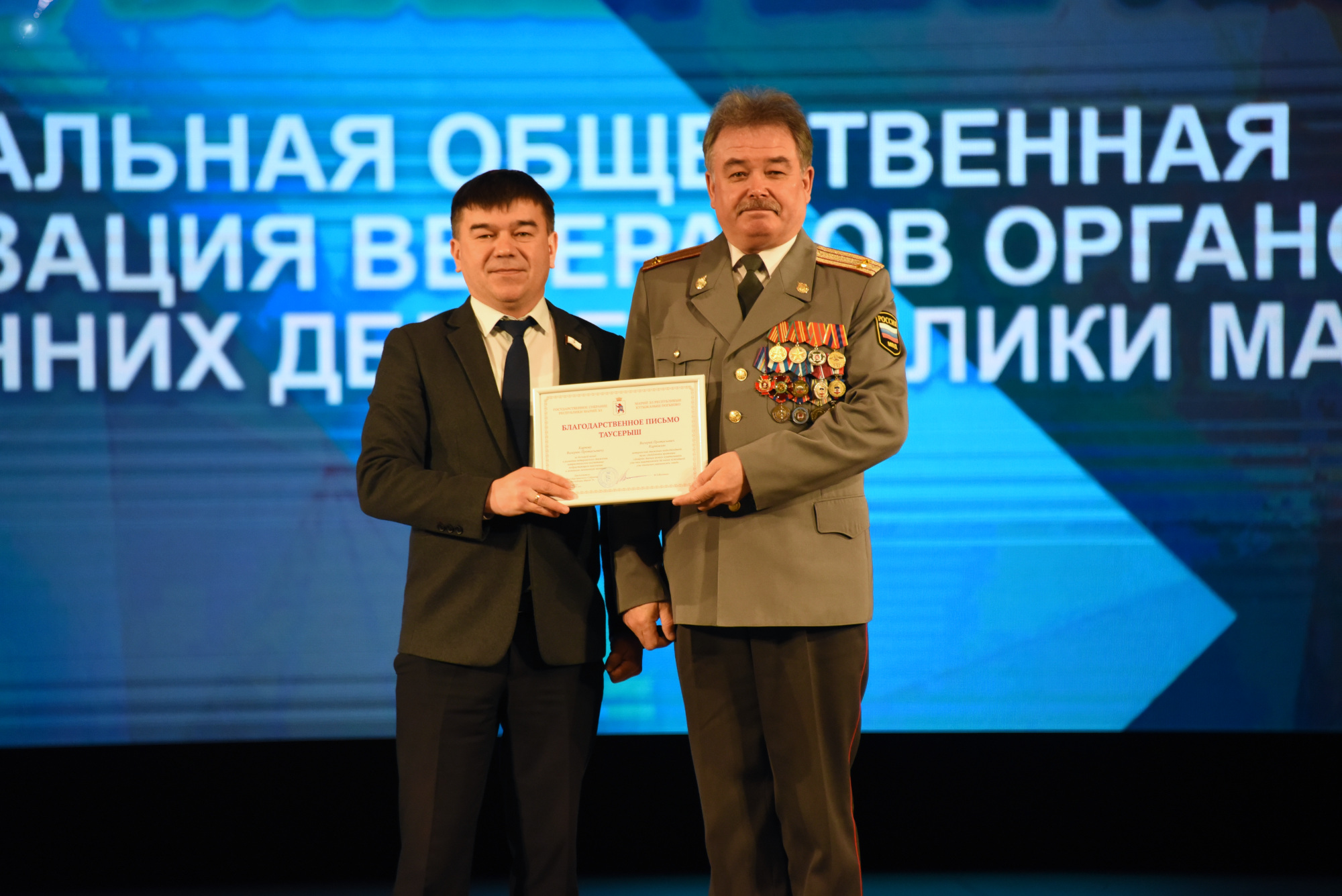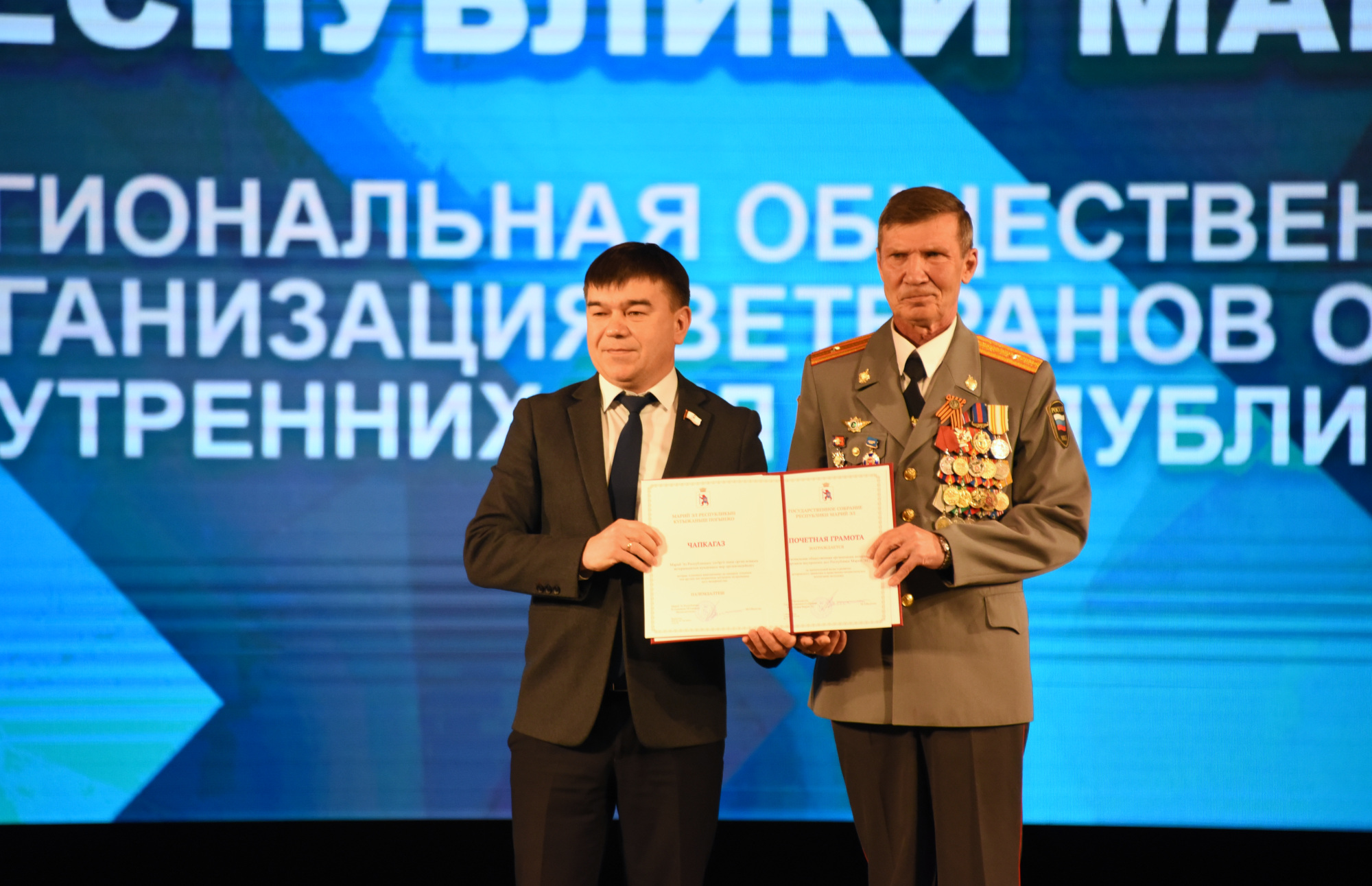 Благодарностью парламента республики поощрен председатель организации ветеранов Управления МВД России по г. Йошкар-Оле подполковник милиции в отставке Андрей Красиков. Благодарственными письмами Госсобрания отмечены руководители ветеранских организаций Валерий Карпов (отдел МВД «Козьмодемьянский») и Александр Плотников (отделение полиции № 6 по Юринскому району).