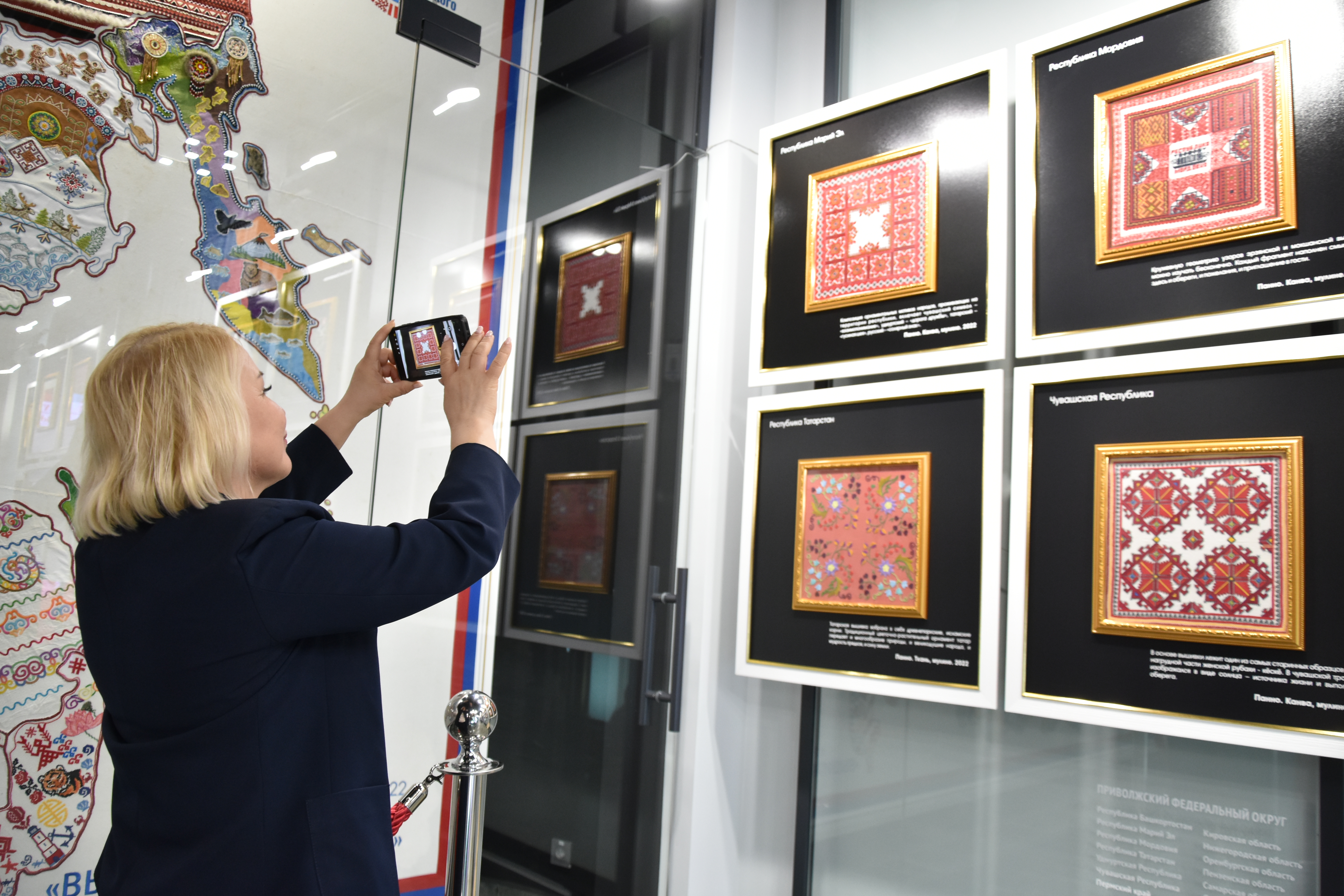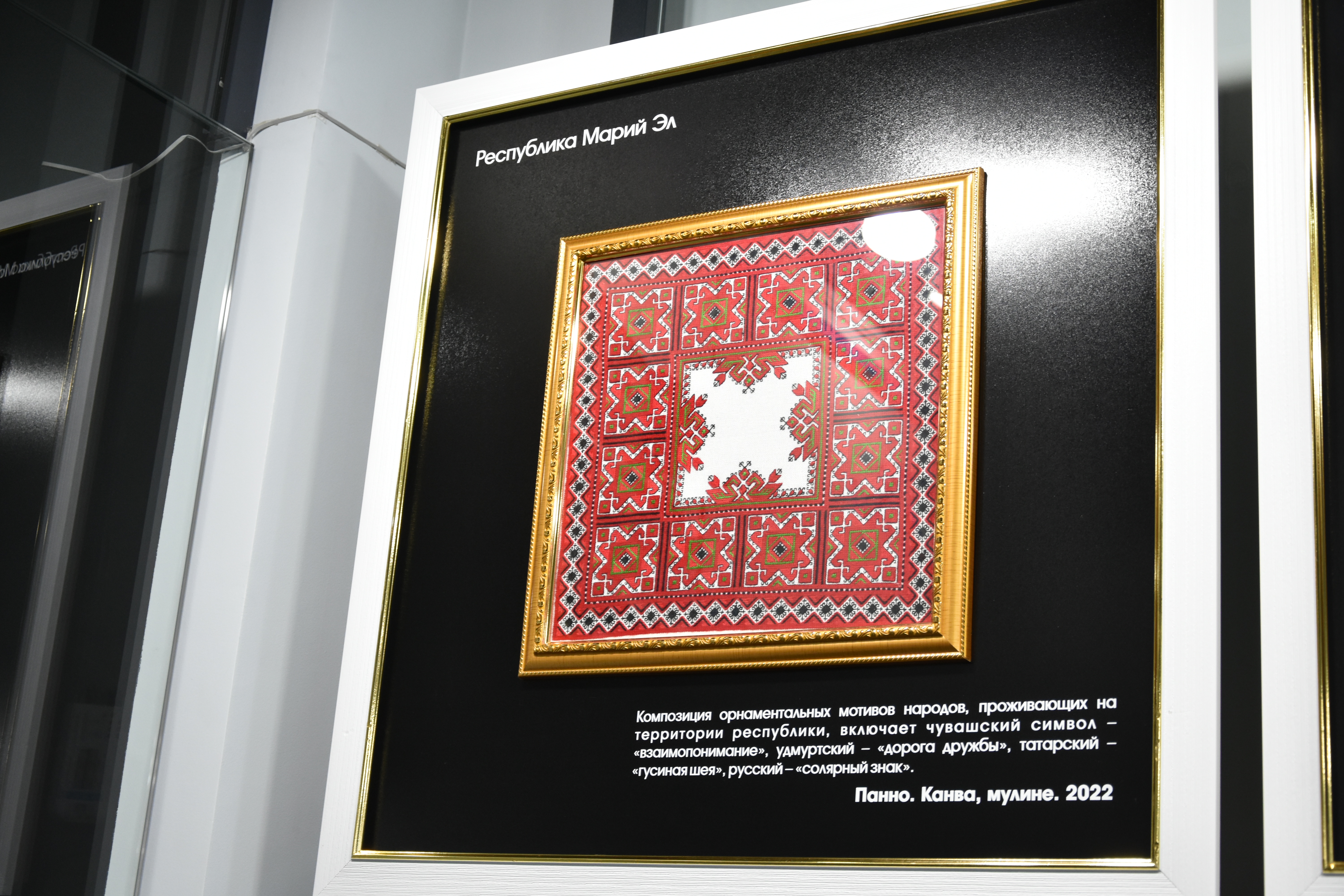 Особый интерес у нашей делегации вызвала коллекция из 84 отдельных панно, отражающих культурное наследие регионов. Одно из них посвящено Республике Марий Эл. Его авторы – марийские вышивальщицы Людмила Ефремова и Ирина Чугунова.